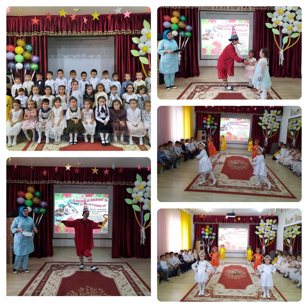 Праздник начался с торжественных звуков фанфар и продолжился приветственным словом заведующего Межидовой Х. А., которая поздравила всех с профессиональным праздником. И конечно, весь коллектив детского сада поздравили воспитанники. Они не забыли никого, рассказывали стишки о любимых воспитателях и нянях, о заведующей, о поварах и медсестре и других работниках садика. Много тёплых слов благодарности прозвучало в этот день. Дети с удовольствием читали стихи, пели песни, танцевали, дарили свои солнечные улыбки любимым педагогам. Дети очень обрадовались появлению на празднике одного из любимых героев- Буратино. Ребята научили Буратино выполнять ритмогимнастику, подарили танец «Любовь к воспитателю». В свою очередь, Буратино тоже поздравил всех работников детского сада теплыми словами. Мероприятие прошло в теплой и празднично-веселой атмосфере. Мы попросили воспитанников детского сада ответить на вопрос: «А какой он, ваш детский садик?» И услышали вот такие ответы: «Он хороший, красивый, любимый, самый лучший!». Думается, это и есть настоящая оценка работы всех сотрудников.