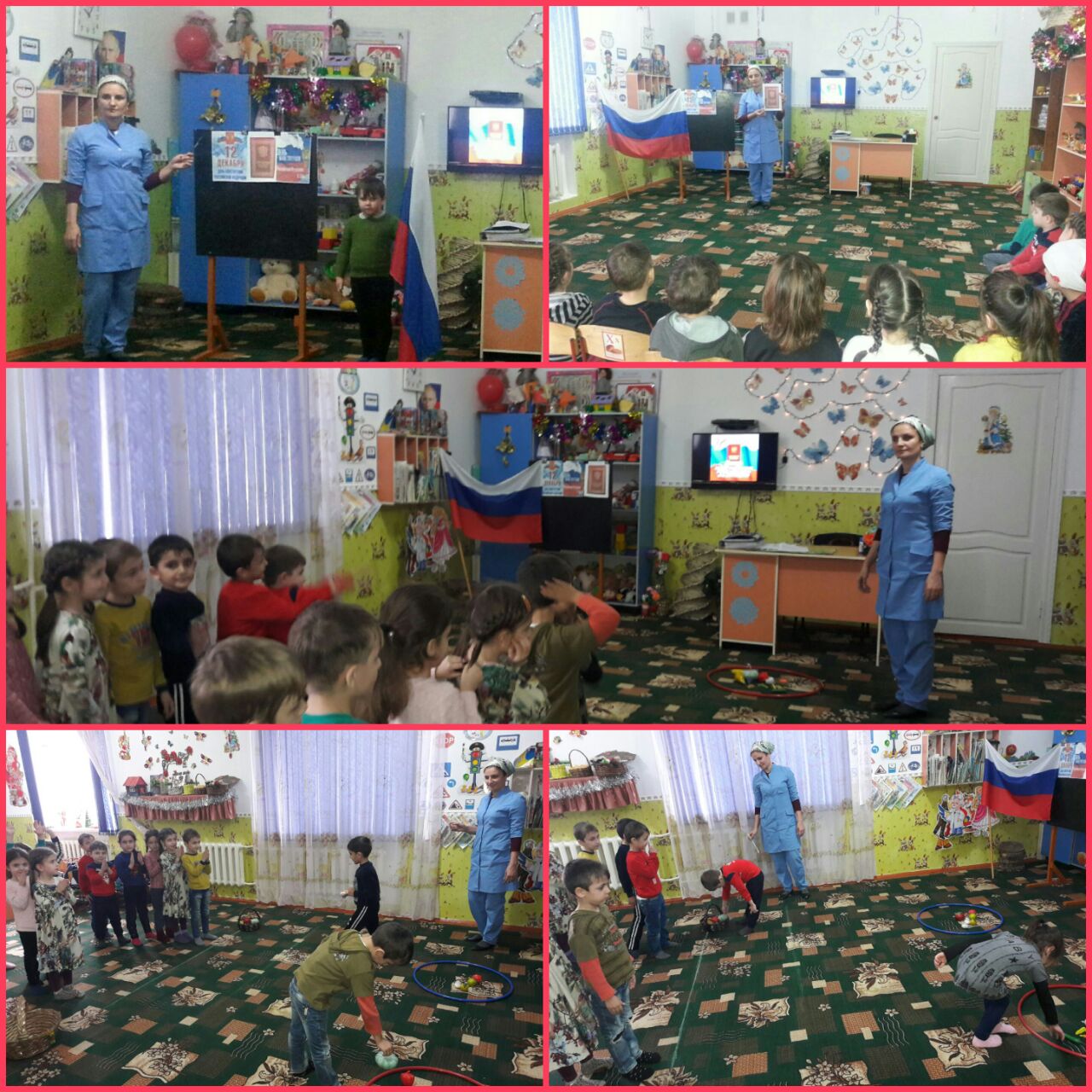 11.12.2017Ко Дню Конституции РФ воспитатели старших и средних групп провели тематические занятия на тему: «Что такое Конституция?» Проведена работа по художественно-эстетическому воспитанию на тему: «Флаг РФ». Детишки средних и старших групп показали свои способности в рисовании и аппликации российских флажков. Для детей среднего дошкольного возраста было организовано развлечение «Каждый должен знать Законы своей страны!»